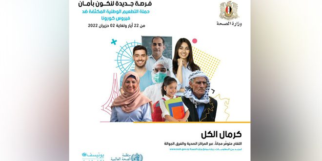 كشفت مديرة الرعاية الصحية الأولية في وزارة الصحة الدكتورة رزان الطرابيشي عن اطلاق حملة وطنية مكثفة للتطعيم ضد فيروس كورونا تحت شعار “فرصة جديدة لنكون بأمان” وذلك اعتباراً من الـ22 من أيار الجاري ولغاية الـ2 من حزيران المقبل.