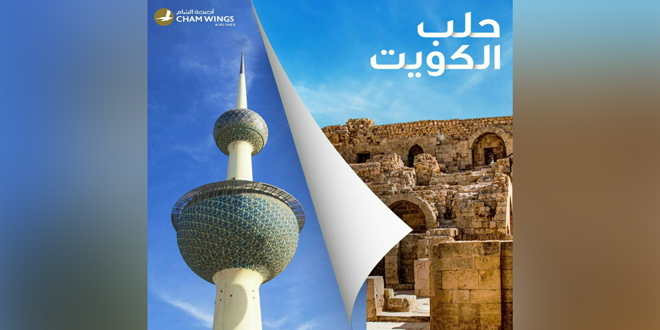 أعلنت شركة أجنحة الشام أنه اعتباراً من يوم الجمعة المصادف الـ 3 من حزيران القادم سيتم تسيير رحلاتها المباشرة بين مطاري حلب والكويت وبالعكس وذلك بمعدل رحلتين أسبوعياً يومي الجمعة والثلاثاء.