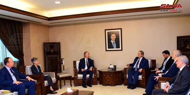 بحث وزير الخارجية والمغتربين الدكتور فيصل المقداد مع المبعوث الخاص للأمين العام للأمم المتحدة إلى سورية غير بيدرسون المواضيع ذات الاهتمام المشترك وجهود الدولة السورية لتدعيم الاستقرار وخاصة عبر توسيع نطاق المصالحات وعمليات التسوية التي جرت وما زالت تجري في مناطق سورية مختلفة.