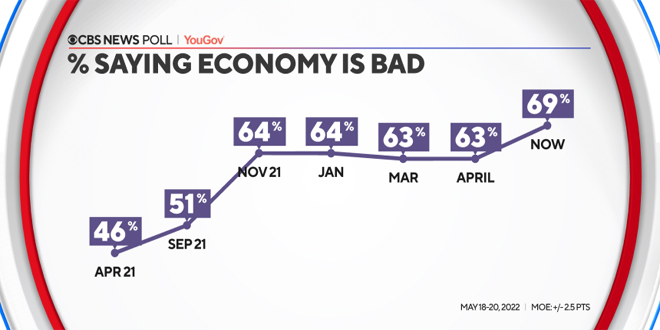 ووجد الاستطلاع الذي أجرته شبكة CBS الإخبارية بالاشتراك مع مركز يو غاف للدراسات والأبحاث ونشر نتائجه موقع اكسيوس أن 63 بالمئة من الأمريكيين يشعرون “بعدم الارتياح والقلق” إزاء الوضع في الولايات المتحدة مع ارتفاع معدل التضخم وأسعار الوقود واستمرار جائحة كورونا.