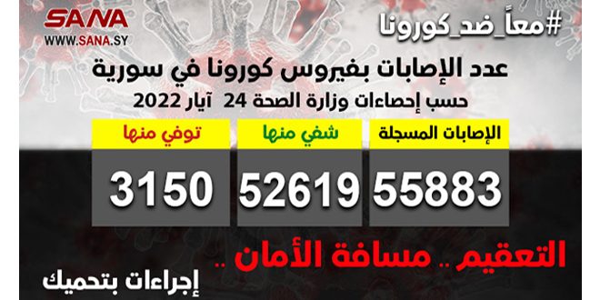 وأوضحت الوزارة في بيان تلقت سانا نسخة منه أن عدد الإصابات المسجلة في سورية بلغ حتى الآن 55883 شفي منها 52619 حالة وتوفي 3150 حالة.