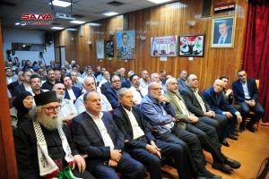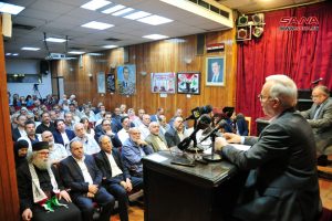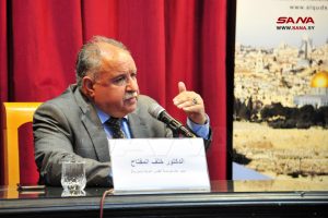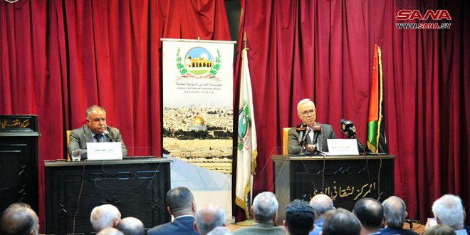 وقدم سفير دولة فلسطين بدمشق سمير الرفاعي عرضاً تاريخياً عن وجود المحتل الصهيوني في فلسطين ودور الدول الاستعمارية وفي مقدمتها بريطانيا في تعزيز وجوده والسيطرة على المنطقة من خلال تقسيمها والاتفاقيات الاستعمارية ووعد بلفور.