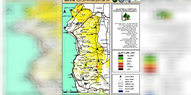 أعلنت منصة الغابات ومراقبة الحرائق (فيرمو) أن مساحات محدودة من المواقع الجنوبية لغابات السفوح الشرقية لسلسلة الجبال الساحلية ومواقع من غابات شمال اللاذقية وحماة تتأثر اليوم بمستوى خطورة مرتفع للحرائق مع بقاء باقي المواقع تحت تأثير المستوى المتوسط.