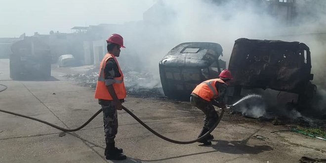 أخمد عناصر الدفاع المدني في محافظة حمص اليوم حريقاً اندلع قرب كراج الحجز في منطقة الصناعة بمدينة حمص.