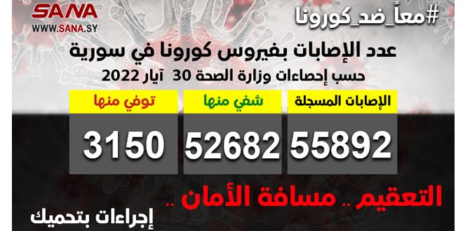 وأوضحت الوزارة في بيان تلقت سانا نسخة منه أن عدد الإصابات المسجلة في سورية بلغ حتى الآن 55892 شفي منها 52682 حالة وتوفي 3150 حالة.