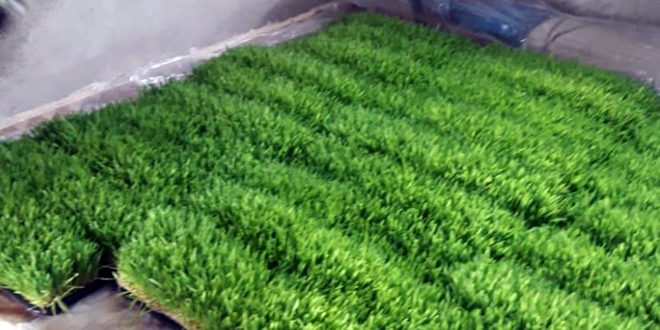وعن آلية إنتاجه تحدث عكو عن خطوات العمل حيث يتم البدء بغسل وتنظيف بذار الشعير وإزالة الشوائب والأتربة ثم تعقيمها وفي المرحلة التالية يتم نقع البذار المعقمة بالماء لمدة 24 ساعة وتفرش بأواني الاستنبات المثقبة من الأطراف لمنع تجمع المياه وترش البذور بالماء بطريقة الرذاذ بمرش يدوي كل 3 -4 ساعات على أن تكون الإضاءة بيضاء ومستمرة على مدار اليوم مشيراً إلى أن الإنتاج يصل إلى نحو 8 كيلوغرامات علف أخضر أسبوعياً من كل 1 كيلوغرام من بذور الشعير.