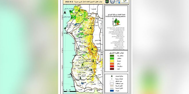 أعلنت منصة الغابات ومراقبة الحرائق فيرمو إن خرائط مؤشرات خطورة الحريق لغابات شمال غرب سورية تشير اليوم إلى تأثر نسبة كبيرة من الغابات على السفوح الشرقية لسلسلة الجبال الساحلية بمستوى الخطورة المرتفع والمتوسط للحرائق بينما تكون غابات السفوح الغربية تحت تأثير مستويي الخطورة المتوسط والمنخفض.