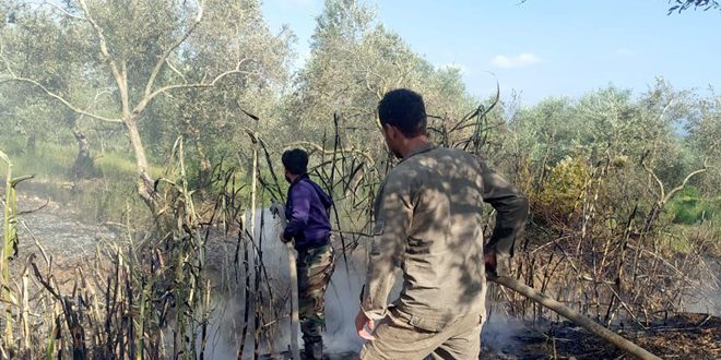 وذكر رئيس الشعبة المهندس محمد صافتلي في تصريح لمراسلة سانا أن الحريق أتى على مساحة تقدر بـ 500 متر مزروعة بالزيتون وعلى مساحة من القصب وتمت السيطرة عليه بمساعدة الأهالي.