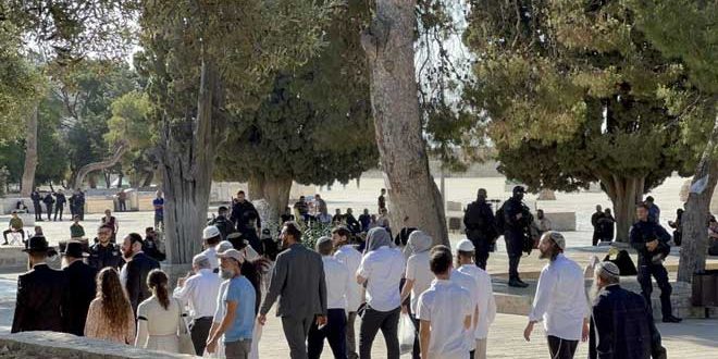 كما كثفت وجودها على طول مسار المستوطنين لتأمين اقتحاماتهم التي بدأت عند الساعة السابعة صباحاً وسط إطلاق قنابل الغاز باتجاه الفلسطينيين ما أدى إلى إصابة عدد منهم بحالات اختناق كما اعتقلت قوات الاحتلال شاباً من ساحات الأقصى .