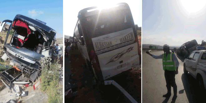 أصيب اليوم 11 شخصاً جراء تدهور حافلة نقل ركاب على طريق حمص- طرطوس قرب مفرق قرية الرابية بمنطقة نزول حديدة بريف حمص الغربي.