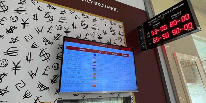ووفق موقع روسيا اليوم أظهرت بيانات بورصة موسكو تراجع سعر صرف الدولار بواقع 1.36 روبل إلى 59.72 روبلاً وسعر صرف اليورو بواقع 1.96 روبل إلى63.61 روبلاً.