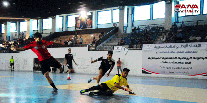 يتنافس 18 فريقاً للرجال وستة فرق للسيدات من مختلف الجامعات الحكومية والخاصة والمعاهد في البطولة الرياضية الجامعية المركزية لكرة قدم الصالات التي يقيمها الاتحاد الوطني لطلبة سورية في مدينة الجلاء الرياضية بدمشق.