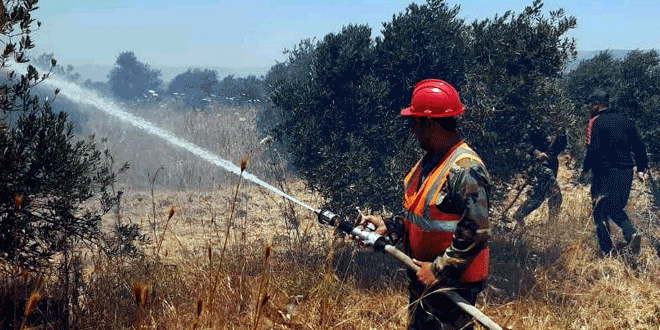 أخمد عناصر الإطفاء في محافظة حمص اليوم حريقاً اندلع في أشجار زيتون ومحاصيل زراعية في قرية السنديانة بريف المحافظة الغربي.