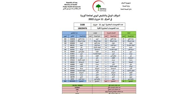 وذكرت وزارة الصحة العراقية في بيان لها اليوم إن إجمالي عدد الإصابات بالفيروس في البلاد بلغ 2329662 إصابة توفي منها 25222 حالة وتعافى 2303059 شخصاً.