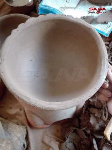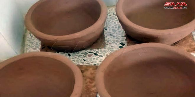 وحول آلية صناعة مقلي الفخار الذي عرف كوعاء مخصص للطبخ يزيد عمره على 8 قرون أوضحت خدوج لمراسلة سانا أن صناعته تتطلب نوعاً خاصاً من التراب الذي يتم نقعه بالماء ثم نأتي بحجر بلوري ندقه ونطحنه للحصول على مسحوق أبيض ناعم يضاف إلى خليط التراب المنقوع بالماء ليمنحه التماسك والقوة ثم ندق التراب بعد رش المسحوق الملحي عليه ونعجن الخليط ثم نضعه على قاعدة خشبية لنقوم بعدها بصناعة تجويف عميق وبذلك تبدأ مرحلة تدوير المقلي ويأخذ الخليط شكل الوعاء.