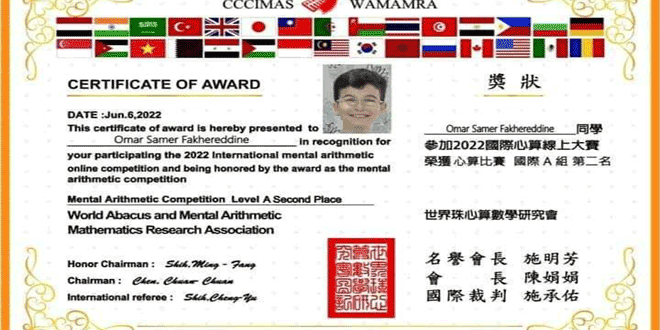 أحرز اليافع السوري عمر سامر فخر الدين المرتبة الثانية في مسابقة الحساب الذهني التي أقيمت في تايوان مؤخراً وشارك فيها طلاب من مختلف دول العالم بعد أن حصل في وقت سابق على المرتبة الأولى في سورية خلال المسابقة التي نظمتها مؤسسة “علمني” المتخصصة بتنمية المهارات الفكرية عبر عدة برامج إثرائية للمواد التعليمية.