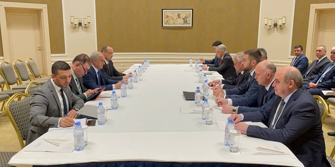 عقدت في العاصمة الكازاخية صباح اليوم جلسة مباحثات رسمية بين وفدي الجمهورية العربية السورية برئاسة الدكتور أيمن سوسان معاون وزير الخارجية والمغتربين ووفد روسيا الاتحادية برئاسة الكسندر لافرنتييف المبعوث الخاص للرئيس الروسي إلى سورية.