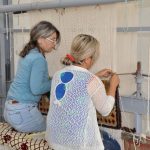 ساعات طويلة تقضيها المتدربات في المركز حول طاولة العمل كل منهن تمسك سنارتها وتبدأ بالحياكة وسط أجواء تفاعلية ومسلية حسب وصفهن بينما يعلو صوت النول في الصالة المجاورة حيث تعمل كل سيدتين على النول ويتقاسمن الادوار لإنجاز السجادة بأسرع وقت ممكن.