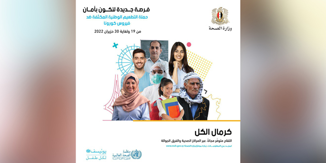 وكانت مديرة الرعاية الصحية الأولية في الوزارة رزان الطرابيشي أوضحت في تصريح سابق لـ سانا أن الوزارة أتمت جميع الاستعدادات الفنية واللوجستية لإطلاق الحملة للوصول إلى جميع المواطنين ممن لم يحصلوا على اللقاح مبينة أن نحو 7400 عامل صحي يشاركون بالحملة عبر 37 مشفى و986 مركزاً صحياً و386 فريقاً جوالاً.