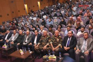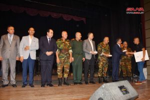 حضر حفل التكريم أمين فرع حلب لحزب البعث العربي الاشتراكي أحمد منصور واللواء قائد المنطقة الشمالية واللواء قائد شرطة المحافظة.