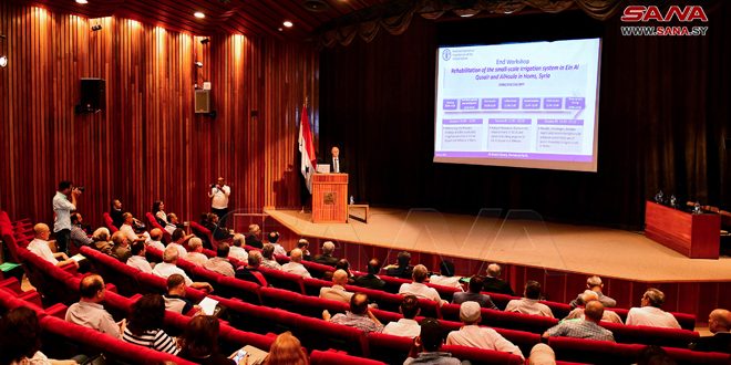تقييم نتائج إعادة تأهيل مشروعي ري عين القصير والحولة في محافظة حمص وانعكاساته الإيجابية على الفلاحين كان محور ورشة العمل التي أقيمت اليوم في مكتبة الأسد بدمشق بحضور وزير الموارد المائية الدكتور تمام رعد وممثل منظمة الأغذية والزراعة التابعة للأمم المتحدة في سورية “الفاو” مايك روبسون والممثل والمدير القطري لبرنامج الأغذية العالمي في سورية روس سميث.