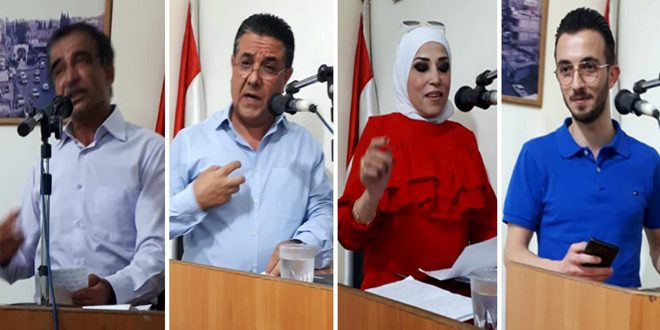 وألقى الشاعر ثابت معلم عدداً من نصوصه الشعرية التي جاءت بأسلوب الشطرين معتمداً تناسق الموضوع وانسجامه مع العاطفة واللغة ولا سيما في القصائد التي جاءت في محبة الوطن ومشاكل الإنسان وهمومه.