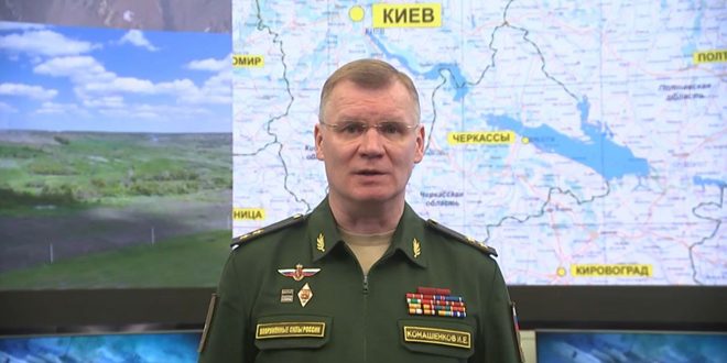 وأضاف كوناشينكوف إنه كجزء من المعارك المضادة للمدفعية أصابت الأسلحة الموجهة بدقة التابعة لقوات الفضاء الروسية في اتجاه دونيتسك ثماني فصائل مدفعية من راجمات أوراغان في مناطق كوراخوفو وأوكراينسك ونوفوسيلوفكا الثانية وفوزدفيزينكا وفصائل مدفعية في مناطق أوكرايينسك وياسنوبرودوفكا التي كانت تقصف مدينة دونيتسك وبلدات أخرى في جمهورية دونيتسك الشعبية.