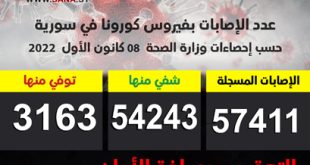 وأوضحت الوزارة في بيان تلقت سانا نسخة منه أن عدد الإصابات المسجلة في سورية بلغ حتى الآن 55922 شفي منها 52754 حالة وتوفي 3150 حالة.