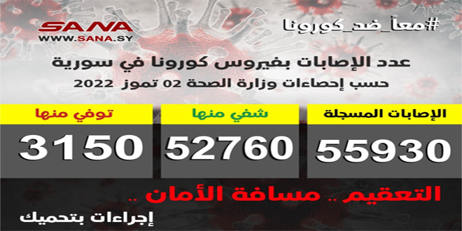 وأوضحت الوزارة في بيان تلقت سانا نسخة منه أن عدد الإصابات المسجلة في سورية بلغ حتى الآن 55930 شفيت منها 52760 حالة وتوفيت 3150 حالة.