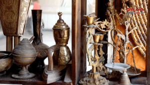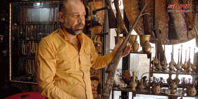 الشاب خالد (42 عاماً) يقول لمراسل سانا إن عمله في مجال السيوف العربية القديمة منذ نحو 20 عاماً وخبرته التي اكتسبها فتحت له الطريق للتعلق بشكل كبير بكل ما هو تراثي قديم حيث بدأ بعملية جمع القطع المتعلقة بذلك بدءاً من عام 2010.