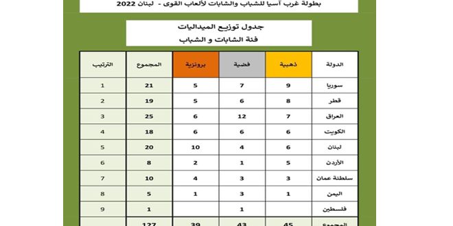 تصدر منتخب سورية لألعاب القوى الترتيب العام لبطولة غرب آسيا للشباب والشابات التي اختتمت اليوم في العاصمة اللبنانية بيروت.