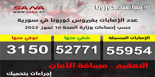 وأوضحت الوزارة في بيان تلقت سانا نسخة منه أن عدد الإصابات المسجلة في سورية بلغ حتى الآن 55954 شفيت منها 52771 حالة وتوفيت 3150 حالة.