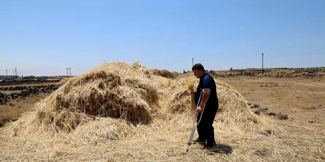 في أرضه الزراعية الواقعة ضمن قرية التنونة بريف حمص أسس الجريح عيسى إبراهيم مشروعه الخاص واستثمر مساحة أرضه الصغيرة في زراعة القمح ضمن إمكانيات محدودة أخذت تتطور باجتهاده وعرق جبينه.