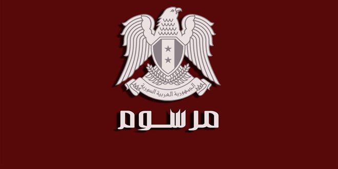 أصدر السيد الرئيس بشار الأسد اليوم المرسوم التشريعي رقم 12 لعام 2022 القاضي بتمديد العمل بأحكام المرسوم التشريعي رقم 14 لعام 2020 وذلك لغاية تاريخ 31-7-2023.