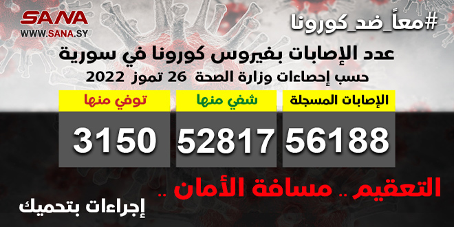 وأوضحت الوزارة في بيان تلقت سانا نسخة منه أن عدد الإصابات المسجلة في سورية بلغ حتى الآن 56188 شفي منها 52817 حالة وتوفي 3150 حالة.