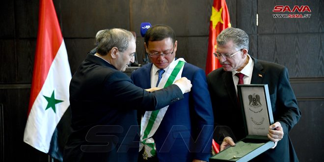 وزير الخارجية والمغتربين الدكتور فيصل المقداد الذي قلد السفير الصيني الوسام في حفل وداع أقامته وزارة الخارجية والمغتربين في فندق داما روز بدمشق اليوم بمناسبة انتهاء مهامه سفيراً لبلاده لدى سورية قال: إن السيد الرئيس بشار الأسد قرر منح وسام الاستحقاق السوري من الدرجة الممتازة للسفير بياو تقديراً لجهوده في تطوير العلاقات بين البلدين الصديقين.