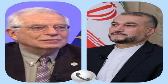 بحث وزير الخارجية الإيراني حسين أمير عبد اللهيان في اتصال هاتفي اليوم مع مسؤول السياسة الخارجية بالاتحاد الأوروبي جوزيف بوريل آخر تطورات المحادثات الجارية لرفع الحظر عن إيران.