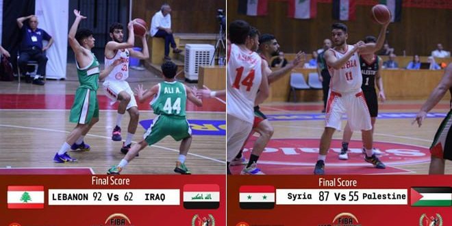 فاز منتخبا سورية ولبنان على فلسطين والعراق بنتيجتي 87-55 نقطة و92-62 نقطة على التوالي وذلك في ختام الدور الأول ببطولة غرب آسيا لكرة السلة لفئة تحت 18 عاماً المقامة في مدينة الفيحاء الرياضية بدمشق.