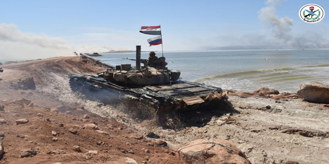 بتوجيه من السيد الرئيس الفريق بشار الأسد القائد العام للجيش والقوات المسلحة وبحضور العماد عبد الكريم إبراهيم رئيس هيئة الأركان العامة والعماد أول الكسندر تشايكو قائد القوات الروسية العاملة في سورية وعدد من كبار ضباط الجيشين السوري والروسي نفذ أحد تشكيلات قواتنا المسلحة وبالتعاون مع القوات الروسية العاملة في سورية مشروعاً تكتيكياً عملياتياً بالذخيرة الحية شاركت فيه مختلف أنواع القوات البرية والجوية والبحرية وصنوف القوات والقوات الاختصاصية في ظروف تحاكي في طبيعتها المعركة الحقيقية.