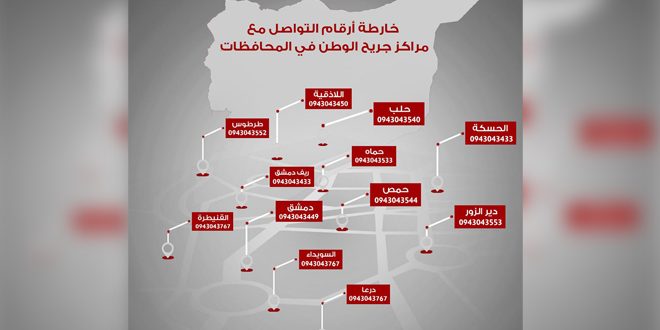 وأوضح مشروع جريح الوطن في صفحته على فيسبوك أن أرقام التواصل هي في محافظة دمشق (0943043449) وفي ريف دمشق (0943043433) وفي حلب (0943043540) وحمص (0943043544) وحماة (0943043533) وطرطوس (0943043552) واللاذقية (0943043450) أما في السويداء ودرعا والقنيطرة فتم تخصيص الرقم (0943043767) ودير الزور (0943043553) وفي الحسكة (0943043433).