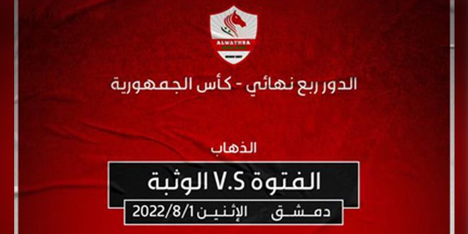 يلتقي فريق الوثبة مع الفتوة غداً على أرض ملعب الفيحاء بدمشق في الدور ربع النهائي لكأس الجمهورية لكرة القدم.
