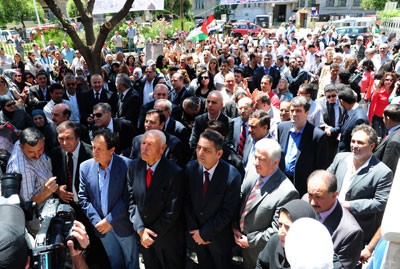 نظم اتحادا الصحفيين والكتاب ونقابة الفنانين وقفة تأييد ودعم للاستحقاق الدستوري لانتخابات رئاسة الجمهورية وللمرشح الدكتور بشار الأسد أمس أمام مقر اتحاد الصحفيين بدمشق.
