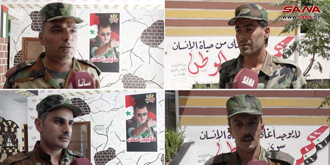 وفي تصريحات لمراسل سانا أشار المقاتل معمر العلي إلى أن رجال الجيش العربي السوري وهم ماضون في الدفاع عن وحدة وسيادة سورية يباركون لأنفسهم وللشعب السوري بمناسبة ذكرى تأسيس الجيش ويعاهدون أبناء الوطن بأنهم سيبقون الجنود الأوفياء المدافعين عن ترابه ضد الإرهابيين وداعميهم حتى تحقيق الانتصار والأمن والاستقرار.
