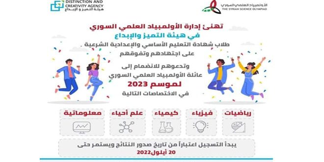 تستمر هيئة التميز والإبداع بقبول طلبات المشاركة في منافسات الموسم الجديد من الأولمبياد العلمي السوري حتى العشرين من شهر أيلول القادم وذلك للطلاب المتفوقين في شهادة التعليم الأساسي.
