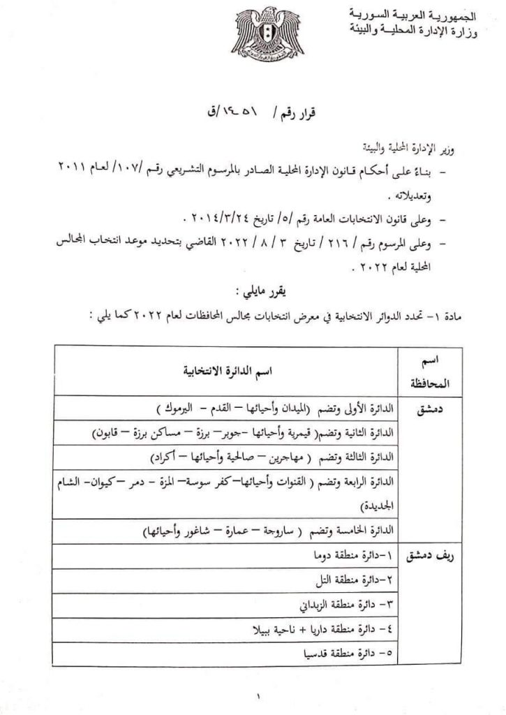 أصدرت وزارة الإدارة المحلية والبيئة القرار رقم “1451” للعام 2022 حددت بموجبه الدوائر الانتخابية في مجالس المحافظات ومدن مراكز المحافظات والمدن التي يزيد عدد سكانها على مئة ألف نسمة.