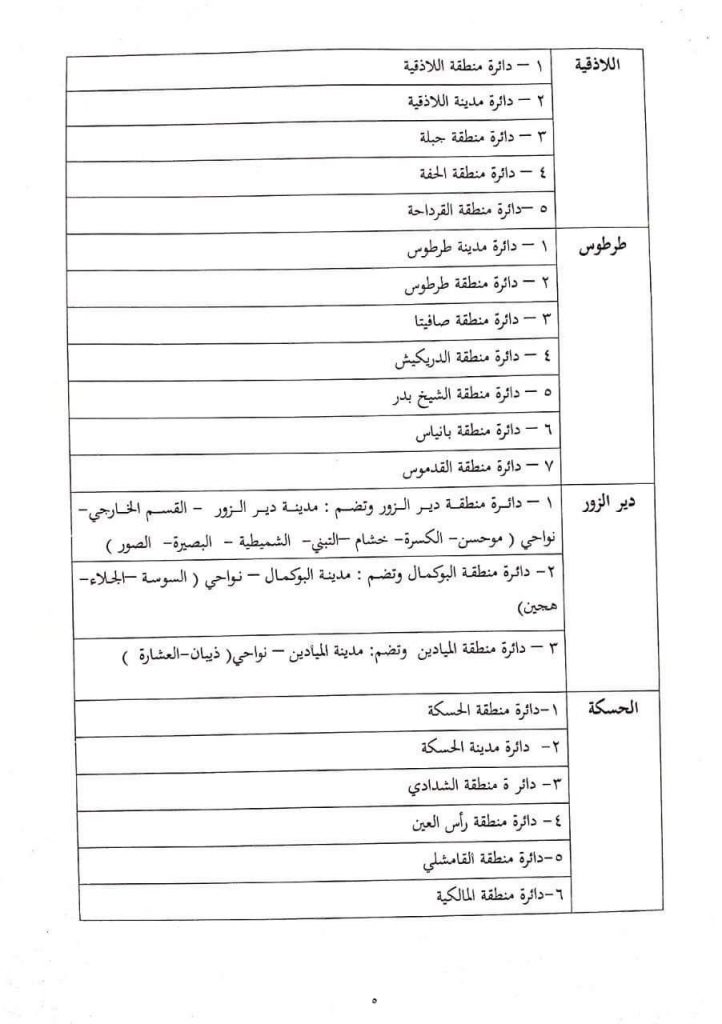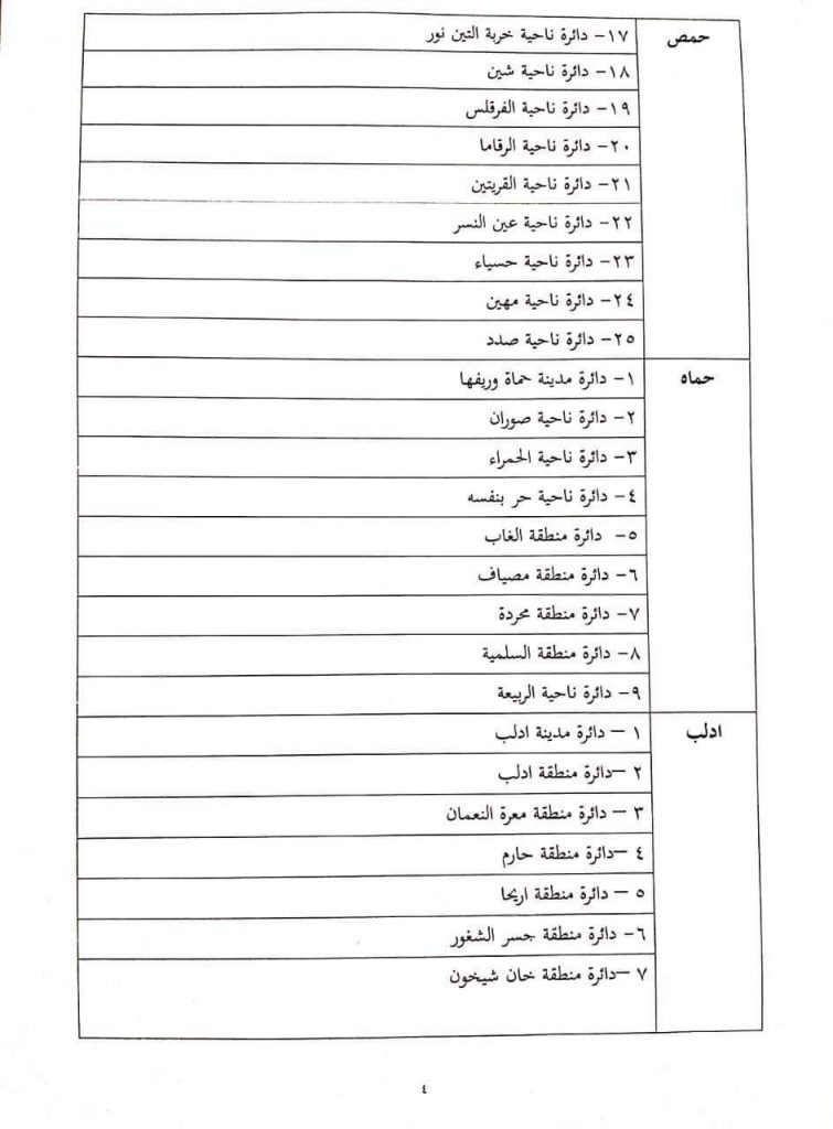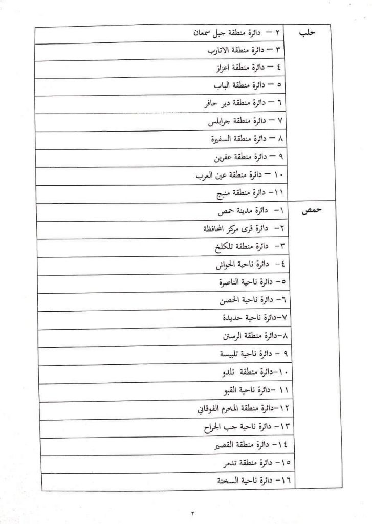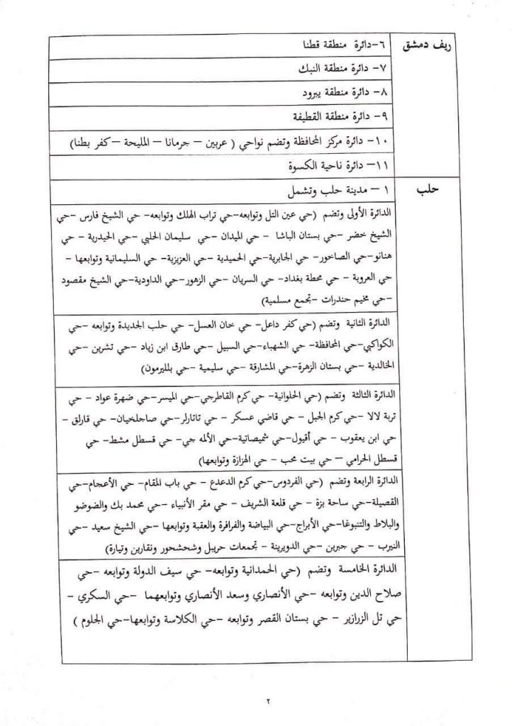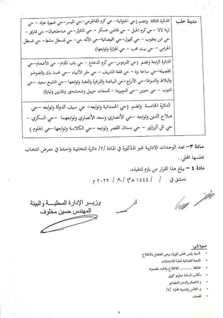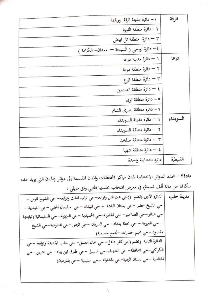 وحدد القرار في مادته الثانية الدوائر الانتخابية لمراكز المحافظات والمدن المقسمة الى دوائر “المدن التي يزيد عدد سكانها على مئة ألف نسمة” في معرض انتخاب مجلسها المحلي وبموجب ذلك تم تحديد “5” دوائر انتخابية في محافظة حلب ودائرة انتخابية واحدة في باقي الوحدات الإدارية غير المذكورة في المادة الثانية للقرار.