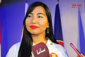 القائم بأعمال السفارة الفلبينية بدمشق فيدا ثريا فيرزوسا أعربت عن تقديرها لصمود الشعب السوري ومواجهته التحديات والصعوبات موضحة أن دبلوماسية الرياضة هي جانب مهم جداً في تعزيز التعاون الثقافي بين الفلبين وسورية وشكل من أشكال تطوير العلاقات.