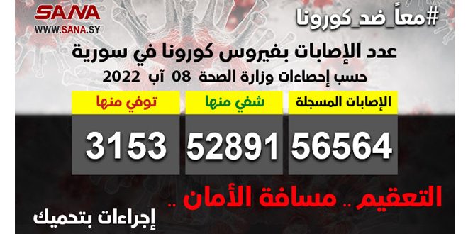 وأوضحت الوزارة في بيان تلقت سانا نسخة منه أن عدد الإصابات المسجلة في سورية بلغ حتى الآن 56564 شفيت منها 52891 حالة وتوفيت 3153 حالة.