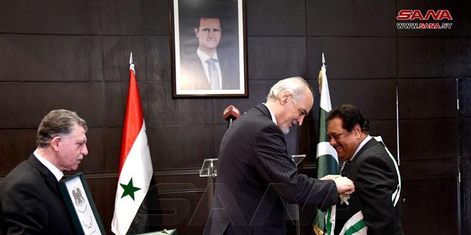 نائب وزير الخارجية والمغتربين الدكتور بشار الجعفري الذي قلد السفير الباكستاني الوسام في حفل وداع أقامته وزارة الخارجية والمغتربين في فندق داما روز بدمشق اليوم بمناسبة انتهاء مهامه سفيراً لبلاده لدى سورية قال: إن السيد الرئيس بشار الأسد قرر منح وسام الاستحقاق السوري من الدرجة الممتازة للسفير محمد خان تقديراً لجهوده في تطوير العلاقات بين البلدين الصديقين.