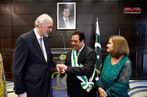 وثمن الدكتور الجعفري موقف باكستان الشجاع والثابت تجاه ما تمر به سورية من خلال سجل تصويتها في المنظمات الدولية رغم الضغوط عليها والتزامها الدائم بسلامة واستقلال وسيادة سورية وحفاظها على العلاقات الدبلوماسية على أعلى مستوى وابقاء سفارتها وسفيرها في دمشق.